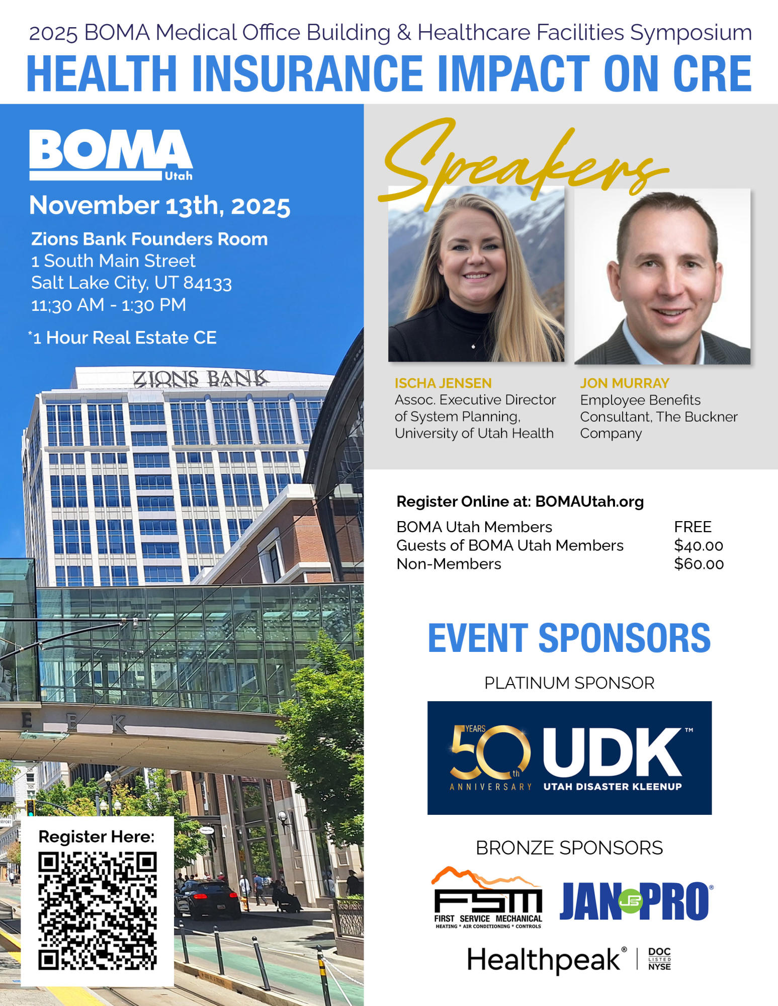 Register now for BOMA Utah's 2025 Medical Office Building Symposium on Thursday, November 13th, 11:30 pm - 1:30 pm. See details below: